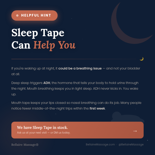 Mouth tape keeps your lips closed so you breathe through your nose like you’re supposed to. Nasal breathing is slower, quieter, and a lot easier on your nervous system. A lot of people who start taping notice fewer middle-of-the-night bathroom trips within the first week.